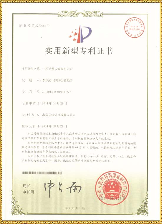 安全閥試驗(yàn)臺專利證書 蝶閥試壓臺專利證書